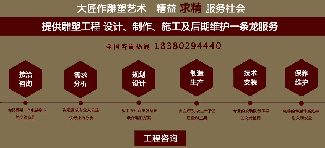 成都大匠作雕塑有限公司,是經(jīng)成都工商局審定注冊的正規(guī)專業(yè)雕塑制作及工程安裝服務(wù)機(jī)構(gòu),是由一群年輕富有朝氣的年輕人創(chuàng)辦,發(fā)軔于四川省成都市龍泉驛區(qū)。它是一家******于創(chuàng)作、制作和銷售為一體的公司。大匠作擁有多年從事公共藝術(shù)的專業(yè)人員和雕塑制作人組成的核心團(tuán)隊,為您提供專業(yè)、具創(chuàng)新的設(shè)計及制作服務(wù)。公司成立以來,秉承“******服務(wù)、誠信為本”的宗旨,以客戶需求為目標(biāo)導(dǎo)向,不斷學(xué)習(xí),進(jìn)取,優(yōu)化和提高服務(wù)質(zhì)量,公司向您******——“您的滿意***是我們的信譽(yù)”,我們將以飽滿的熱情和******的服務(wù)贏得您的贊譽(yù)和支持。 愛心,細(xì)心,耐心,責(zé)任心是我們的要求,盡心盡職,為您打造出創(chuàng)新、專業(yè)、******的設(shè)計方案,我們堅信先做人、后做事,用心對待客戶,實(shí)行透明收費(fèi),人性化服務(wù),本著對客戶負(fù)責(zé),對客戶負(fù)責(zé),更是對自己發(fā)展負(fù)責(zé)的態(tài)度,爭取做到讓每位客戶滿意